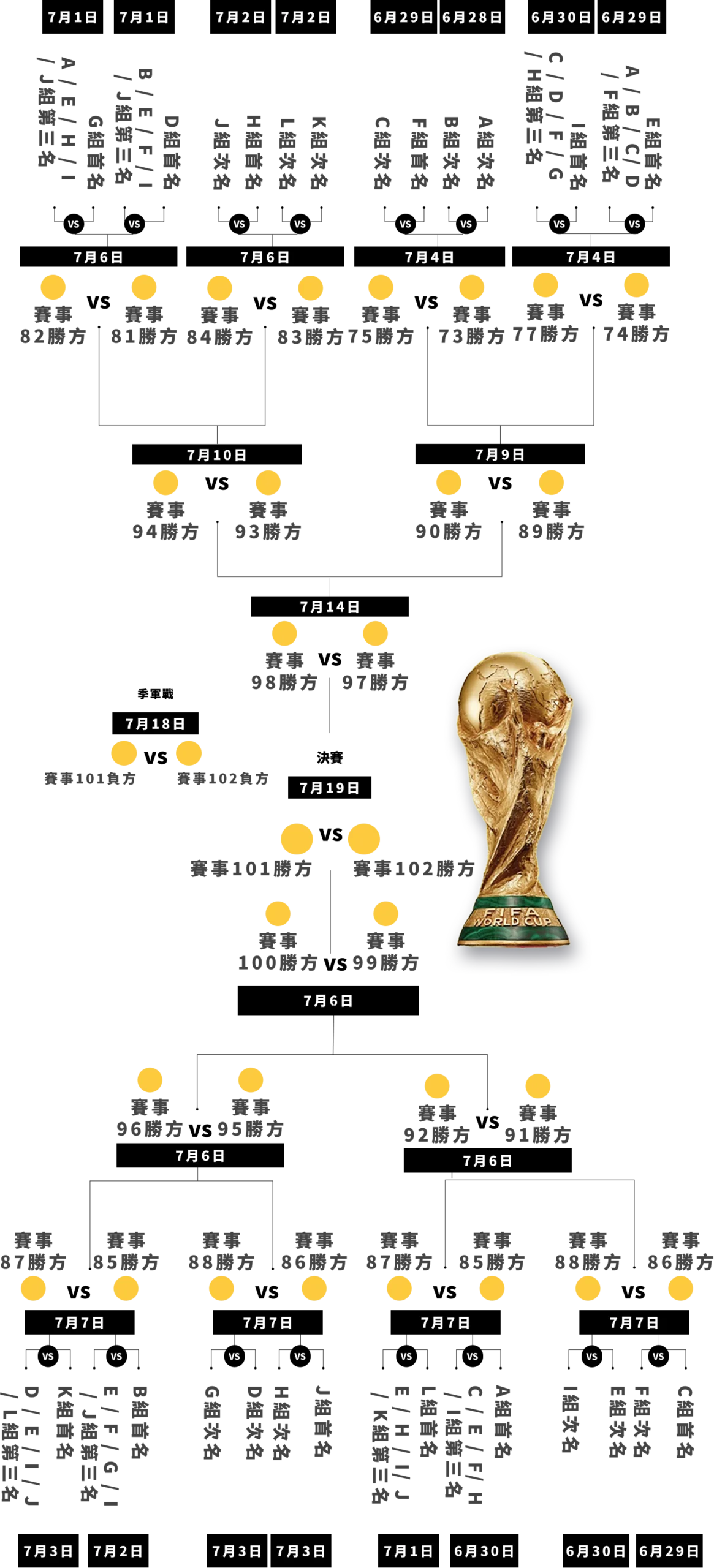 A:世界盃賽制以賽事階段分為:分組賽 → 32強淘汰賽 → 16強淘汰賽 → 8強 → 4強 → 準決賽 → 決賽。